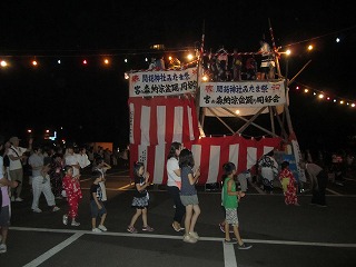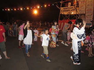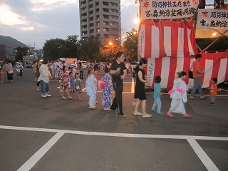 浴衣姿の子どもたちが、やぐらの周りで輪になって踊ります。