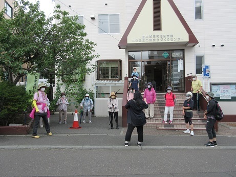 参加者の検温、体調チェックを行った後、介護予防センター宮の森の福井さんから、ソーシャルディスタンスの確保や大声を出さないなどのコロナ対策のほかウォーキングに関する注意事項について説明がありました。