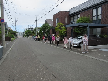 霧雨の中、午前9時に明和地区会館を出発しました。道路は、歩道をお互いの距離をとって歩きました。