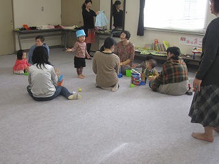 子どもたちは、好きな物を手に取って、思い思いに遊んでいました。子育て支援部会の方々も、子どもたちと一緒に遊んでいただきました。