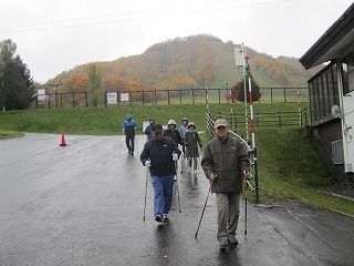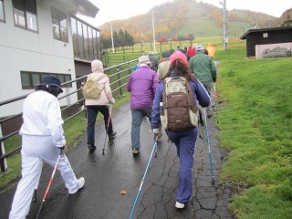 小雨が降る中、山々の紅葉を見ながら、インストラクターの後をついてウォーキングを楽しみました。