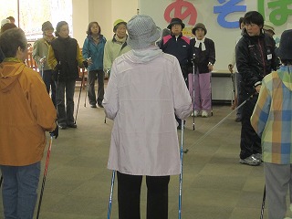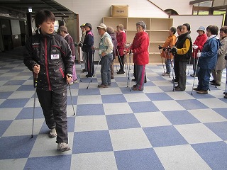 準備体操で体を十分ほぐした後は、インストラクターから、ノルディックウォーキングの方法について、指導を受けました。
