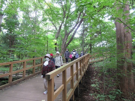 杉やカラマツなどの木々に覆われた木道をさわやかな空気を胸一杯に吸い込みながら進んでいきます。