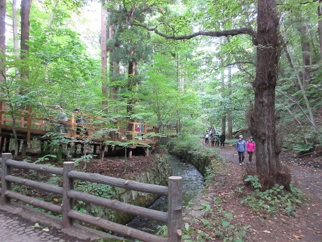ベンチで休憩した後、再び木道を通って戻ります。途中、木道の脇を流れる川にそった道を歩くグループと二手に分かれました。