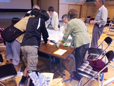 参加者はグループ内で話し合いをしながら「ノロウイルスに感染した子ども」「ペット連れ」「介護が必要な高齢者」など、それぞれの事情が書かれたカードを手にしながら、限られた避難スペースへの割り振りを苦心して行っていた。各グループでの作業終了後、参加者全体でゲームの振り返りが行われ「病気の人は隔離しなければならないが、ノロウイルスに感染した人と、インフルエンザに感染した人を同じ部屋にして良いのか迷った」などの感想が出されていました。