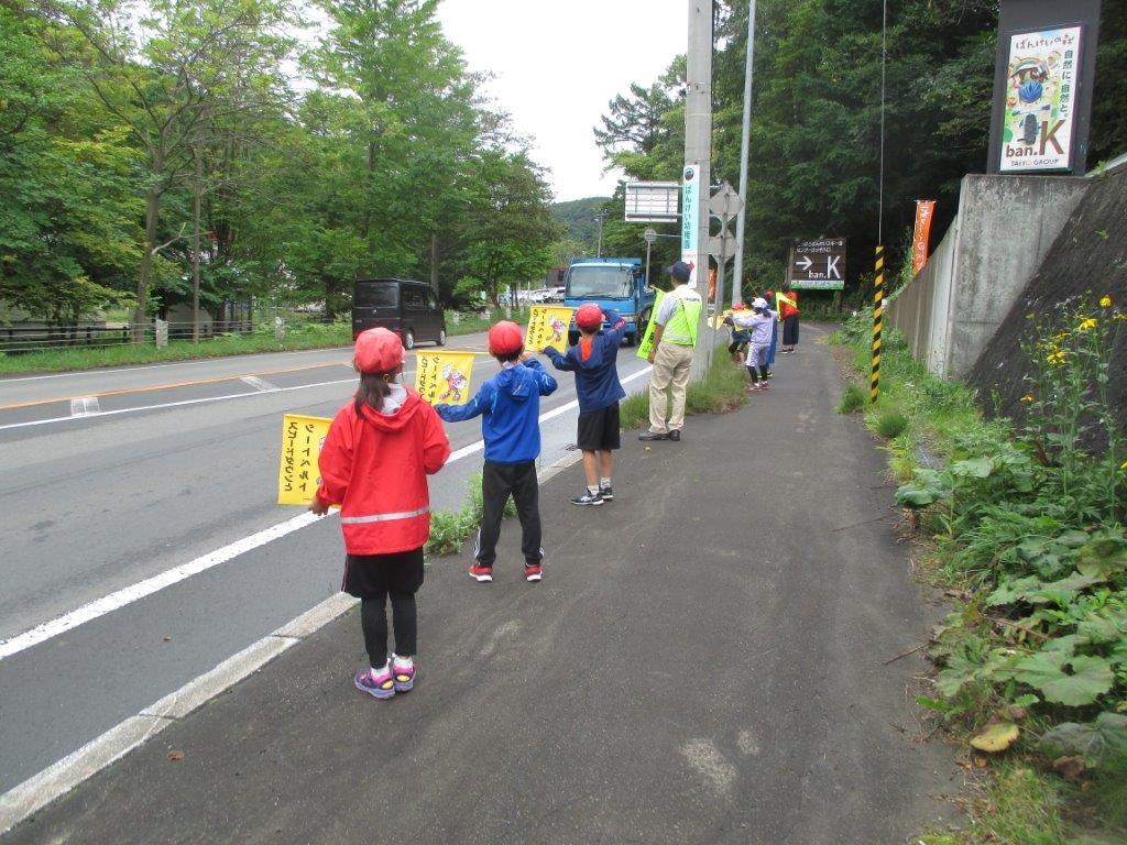 盤渓地区では平成29年に盤渓北ノ沢トンネルが開通したことに伴い交通量が増加したことから、子どもたちのより一層の安全を願い、十数年ぶりに街頭啓発を行ったものです。