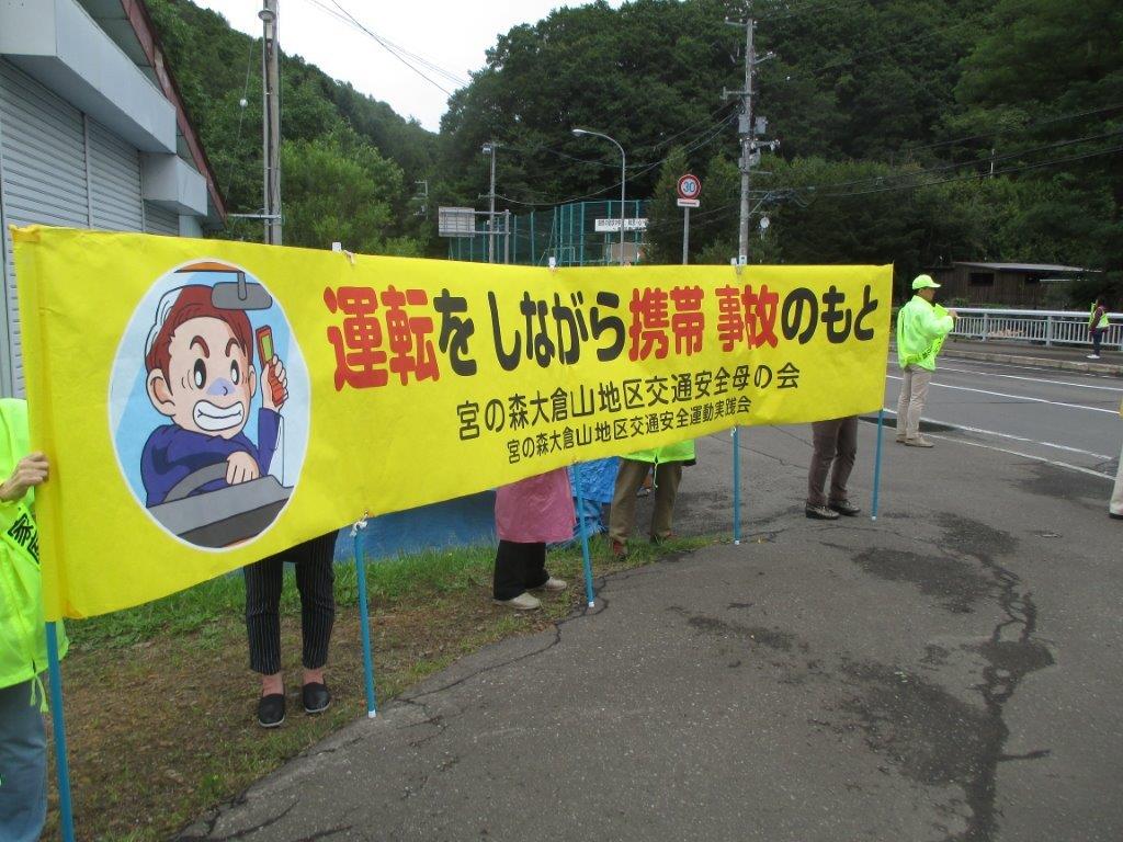 参加者は「運転を しながら携帯 事故のもと」と書かれた横断幕や「スピードダウンとシートベルト」「とまって よく見て みぎ・ひだり」と書かれた旗を持って、「交通安全にご協力を」と大きな声で交通安全を呼びかけました。