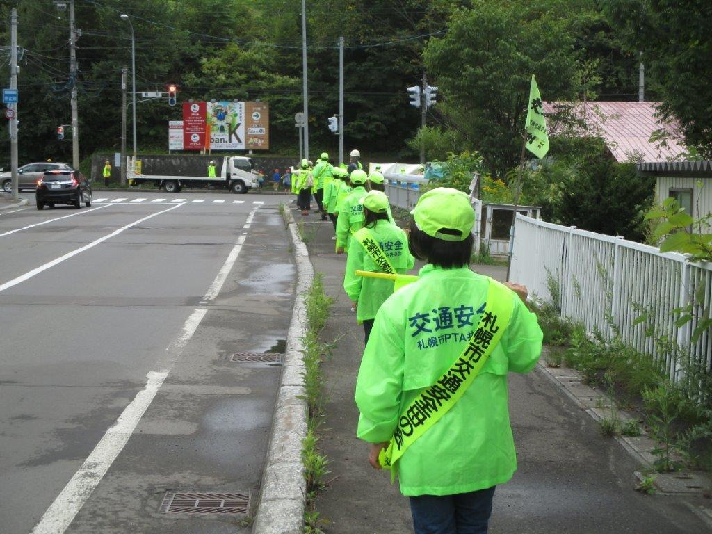 今にも雨が降り出しそうな空模様のなか、盤渓小学校3、4年生40名と宮の森大倉山地区交通安全母の会、交通安全運動実践会、交通安全指導員のほか、盤渓小学校をはじめとしたPTAのみなさん、各学校の校長・教頭先生、中央区役所、西警察署からも駆けつけ、総勢100名が参加しました。