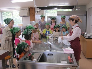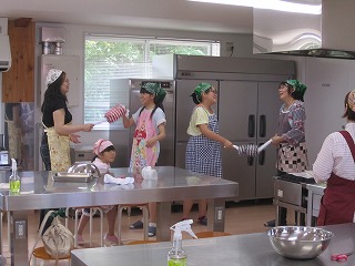 靴を履き替えたり、手を洗ったり、エプロンを着けたりして五つのテーブルに分かれて着席しました。