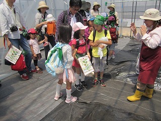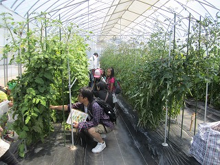 10時45分頃、グループ全員で、ミニトマトを栽培しているビニールハウスに移動。