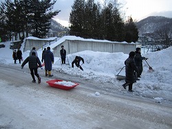 ■それぞれ、スコップを手に持ち、硬い雪を崩して、スノーダンプやそりに乗せて学校の脇まで運びました。
