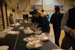 ■さて、この日の夕食はカレーライス。「ハイゼックス炊飯袋」という特殊な袋を使ってお米を炊いて非常食を体験。段々と冷え込んできた中、暖かいごはんに皆さんほっとされていました。