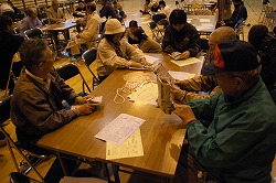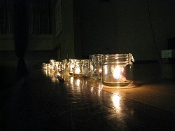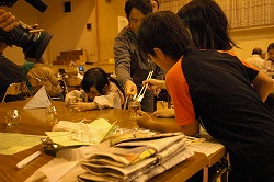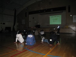■地域子どもネットワーク「みんなの森」による、暗闇の中で音を聞き分けるアトラクションなどの後、硬い体育館の床で寝袋に潜って就寝。朝方に強い雨が降ったこともあって非常に寒く、眠れない方も沢山いらっしゃったようです。