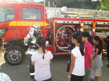 その後、消防車両の見学や区役所職員による熊本地震の際の派遣報告、避難所開設運営訓練などを行いました。