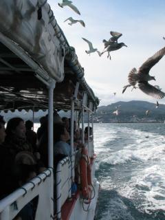 ■一行約70名は、2台のバスに分乗して、まず小樽に向かい、小樽港から遊覧船に乗り祝津港を目指しました。わずか20分あまりの航海でしたが、群れ飛ぶカモメに大人も大興奮。波も穏やかで、楽しいひとときでした。