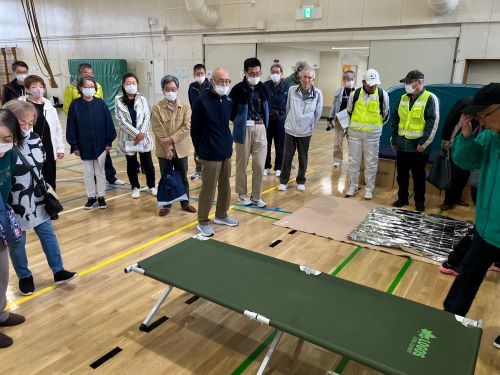 避難所で過ごすことをイメージしながら段ボールベッドや簡易トイレなどの使い方を聞き、実際に見てみて触ってみたり。