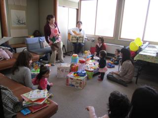 (おもちゃがたくさん。絵本の読み聞かせ。野菜のうたも歌います。)