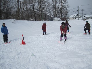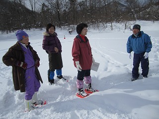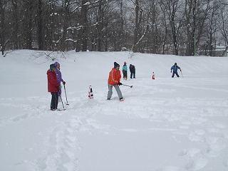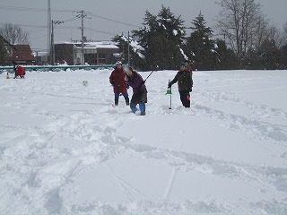 ◆参加者が会場に集合した後、すぐに「体験会」をスタート。今回は、連町健康づくり部の方々が、あらかじめ雪原にコーンを九つ置いてコースを設定しています。参加者は、連町の健康づくり部から発表されたグループ分けにより、2、3人ずつ六つのグループに分かれ、それぞれ3ホールを回って練習し、感触を確かめていました。