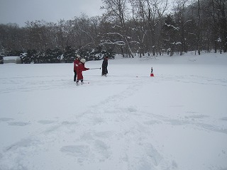 ◆「体験会」を30分間行った後は、いよいよ「大会」本番です。参加した方々は、雪が時折ちらつく中、真剣な眼差しでクラブを振ってコースを1周。会場のあちこちからは「ああ、ボールが飛びすぎた」「ボールが全然飛ばない」といった大きな声が聞こえてきます。吉田所長も初挑戦。思ったとおりの所にボールが飛ばず、苦戦の連続です。一緒にコースを回った第一町内会の佐々木会長から「力まず、肩の力を抜いて打つように」とアドバイスを受けました。ボールを叩きに叩いて何とか全コースをクリアしました。