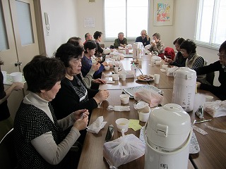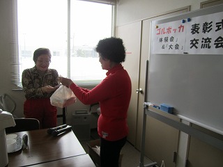 ◆「大会」が終わった後は、宮の森明和地区会館に移動して「表彰式」と「交流会」を開催。結果が発表され、上位2人は同点でしたが、ホールインワンを記録した、荒井山町内会の金子さんが優勝。上位3人に、須藤健康づくり部長から賞品が手渡されました。表彰式に引き続いて、交流会が始まり、温かいスープやコーヒーを飲んだり、軽食をつまんだりしながら、今日のコースや来年度の事業について話し、参加者の間で交流を深めました。