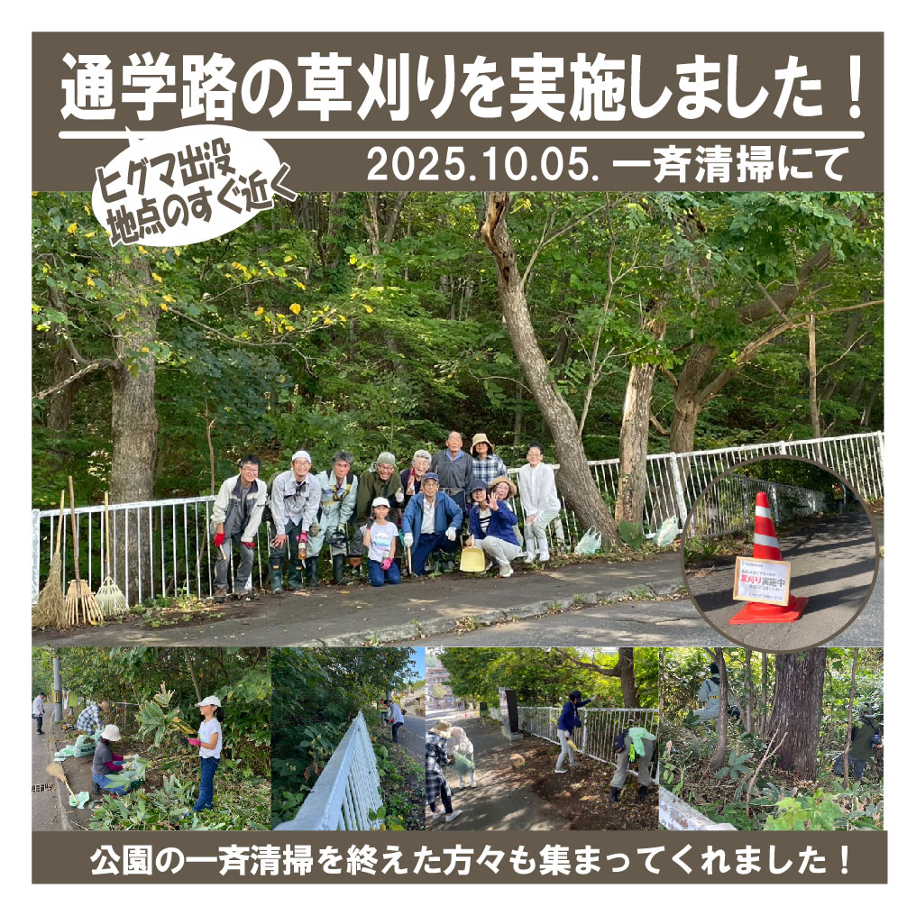 10月5日(日)、月1回の一斉清掃の機会を利用し、通学路の安全確保とヒグマ対策を目的とした草刈りを実施しました。
