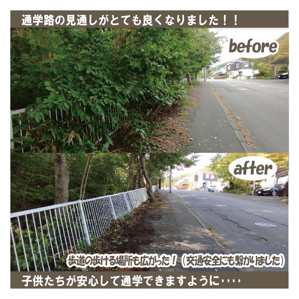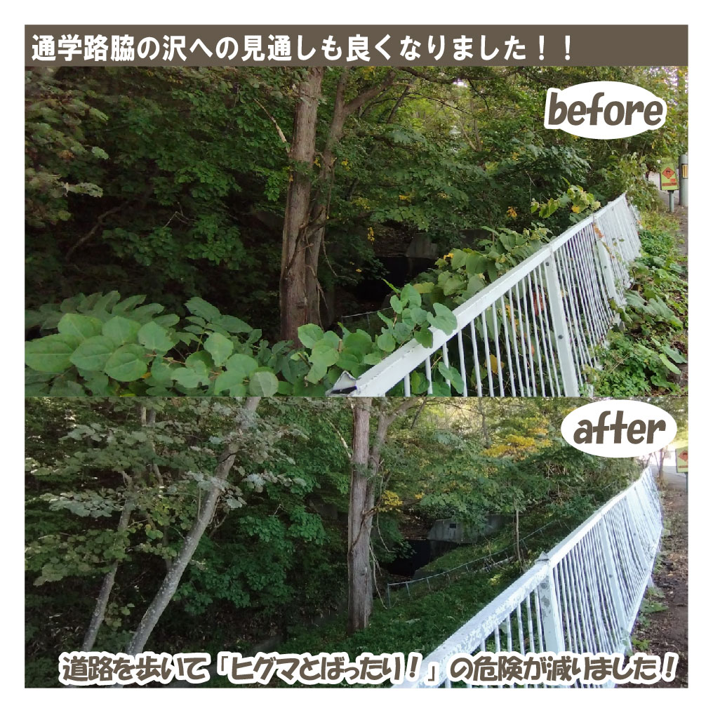 その結果、通学路そのものだけでなく、過去のワークショップ(ヒグマテーブル)で「ヒグマの通り道になっているのではないか?」と懸念されていた沢への見通しも格段に改善されました。