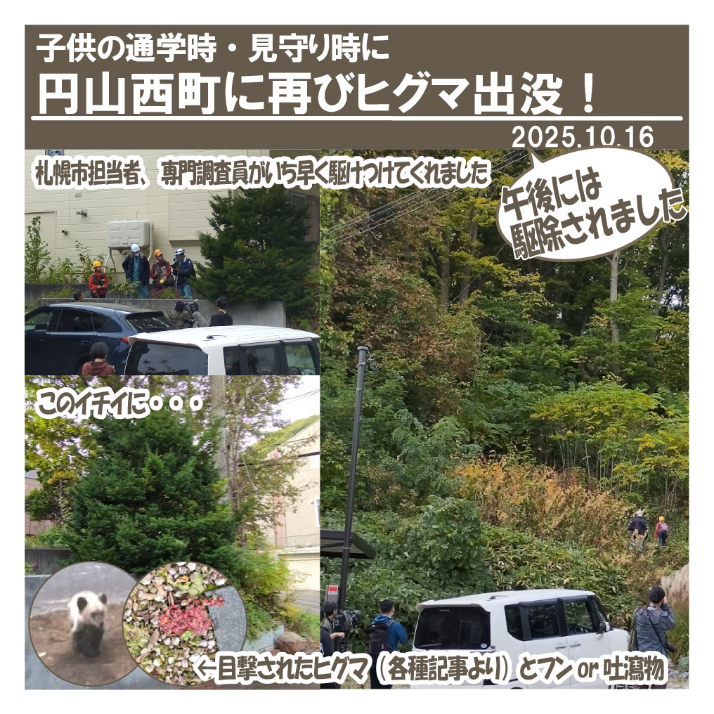 10月16日(木)の朝、円山西町3丁目において、今年に入って3回目となるヒグマの出没情報がありました。今回は子供たちが通学する時間帯であり、また町内会役員有志による「見守り活動」実施中のできごとでした。幸い、けが人はなく、同日夕方には駆除が完了したことを、まずご報告いたします。