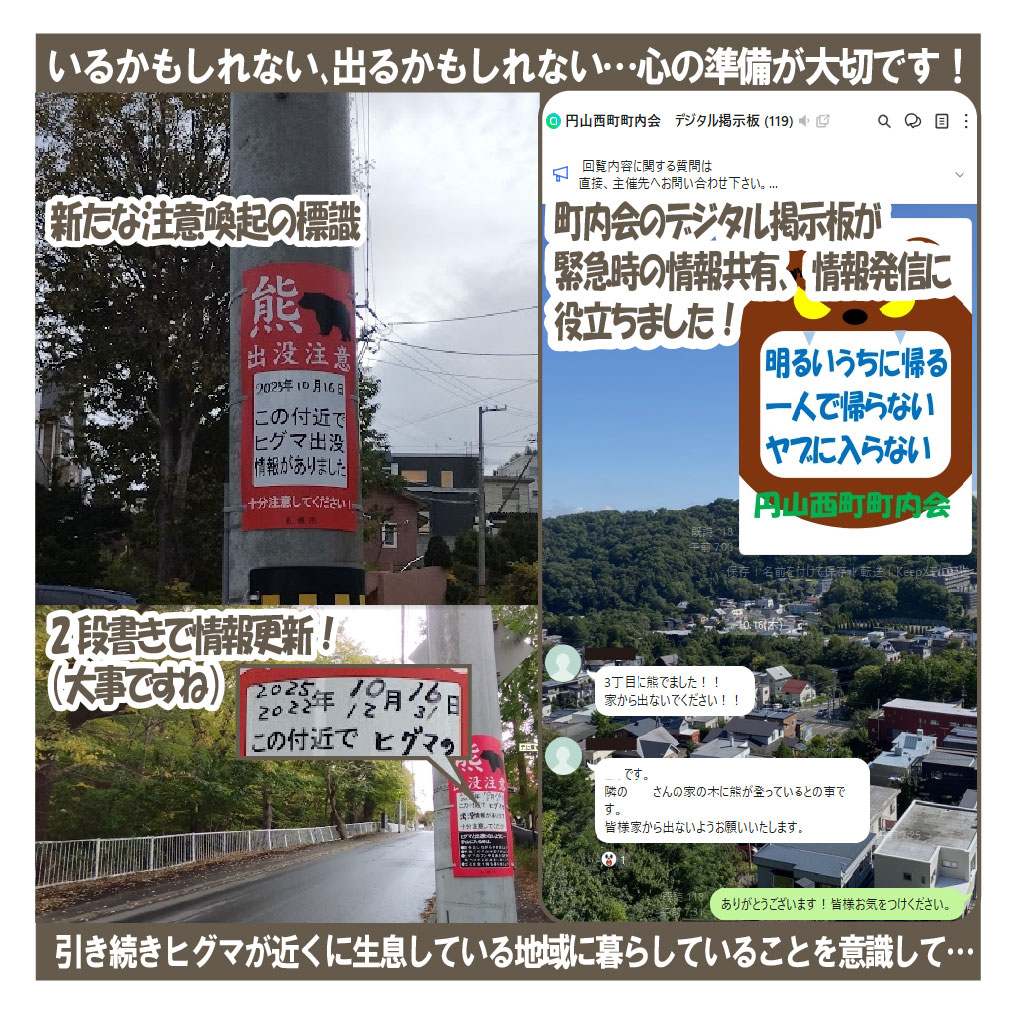 今回のヒグマ出没の第一報は札幌市公式LINE「ヒグマ出没情報」でしたが、その後のヒグマの移動先での第二報は町内会のデジタル掲示板による「3丁目にクマがでました!家から出ないでください!!」という緊急連絡でした。迅速な情報共有だけでなく、万が一の際に地域住民への危険を発信する手段としてデジタル掲示板が有効であること、今後の活用における新たな可能性も強く感じられる機会となりました。