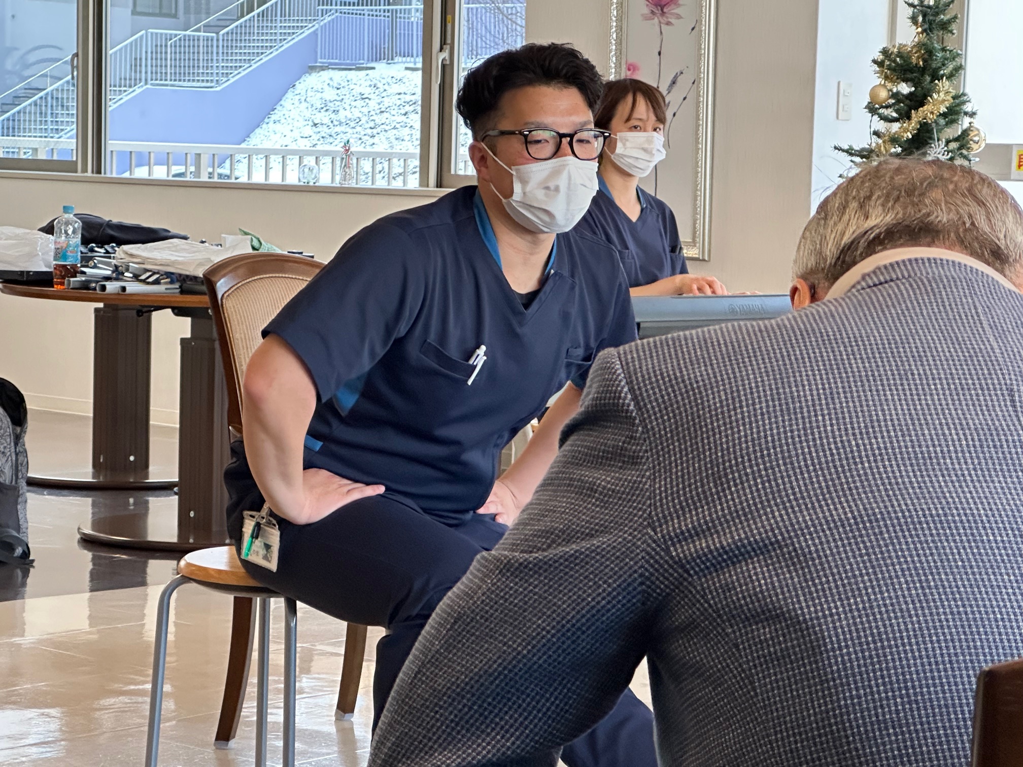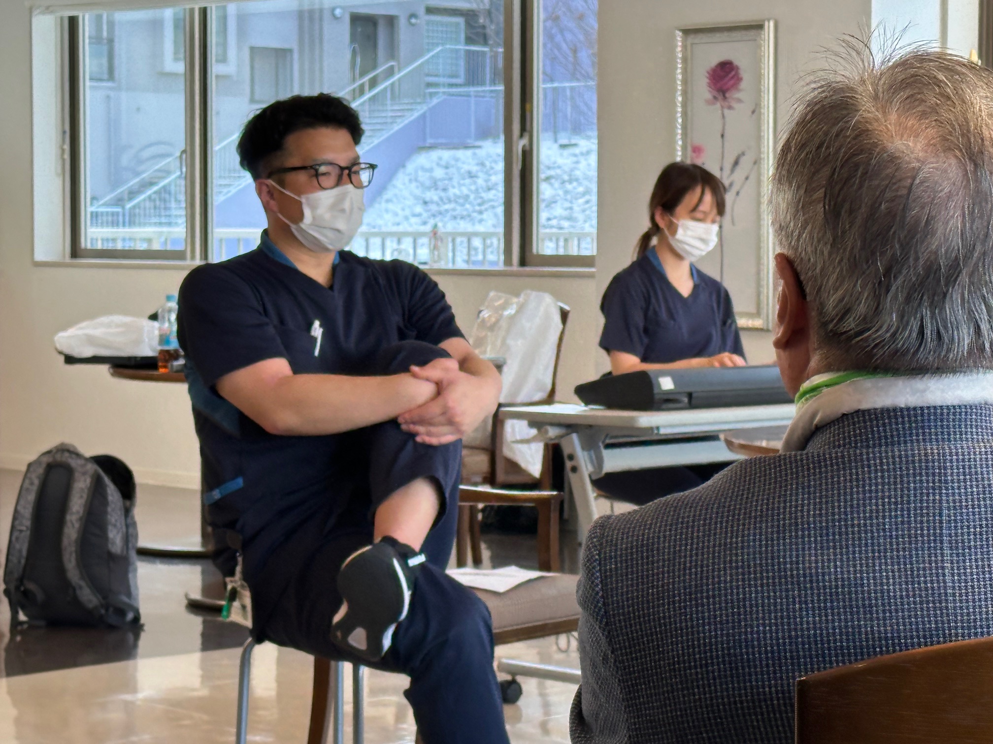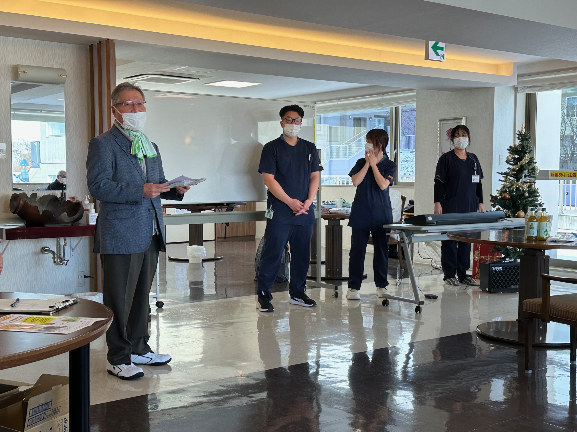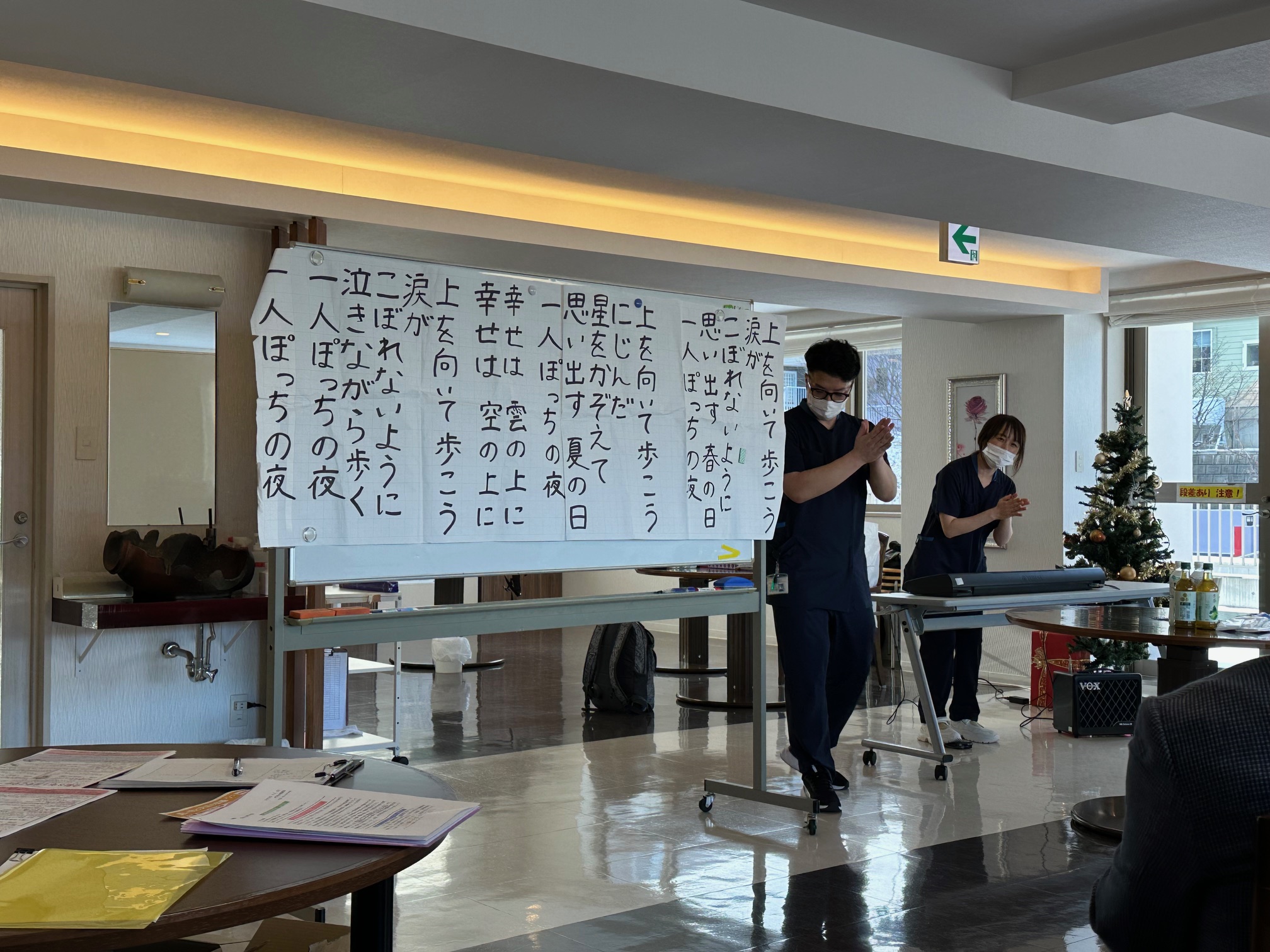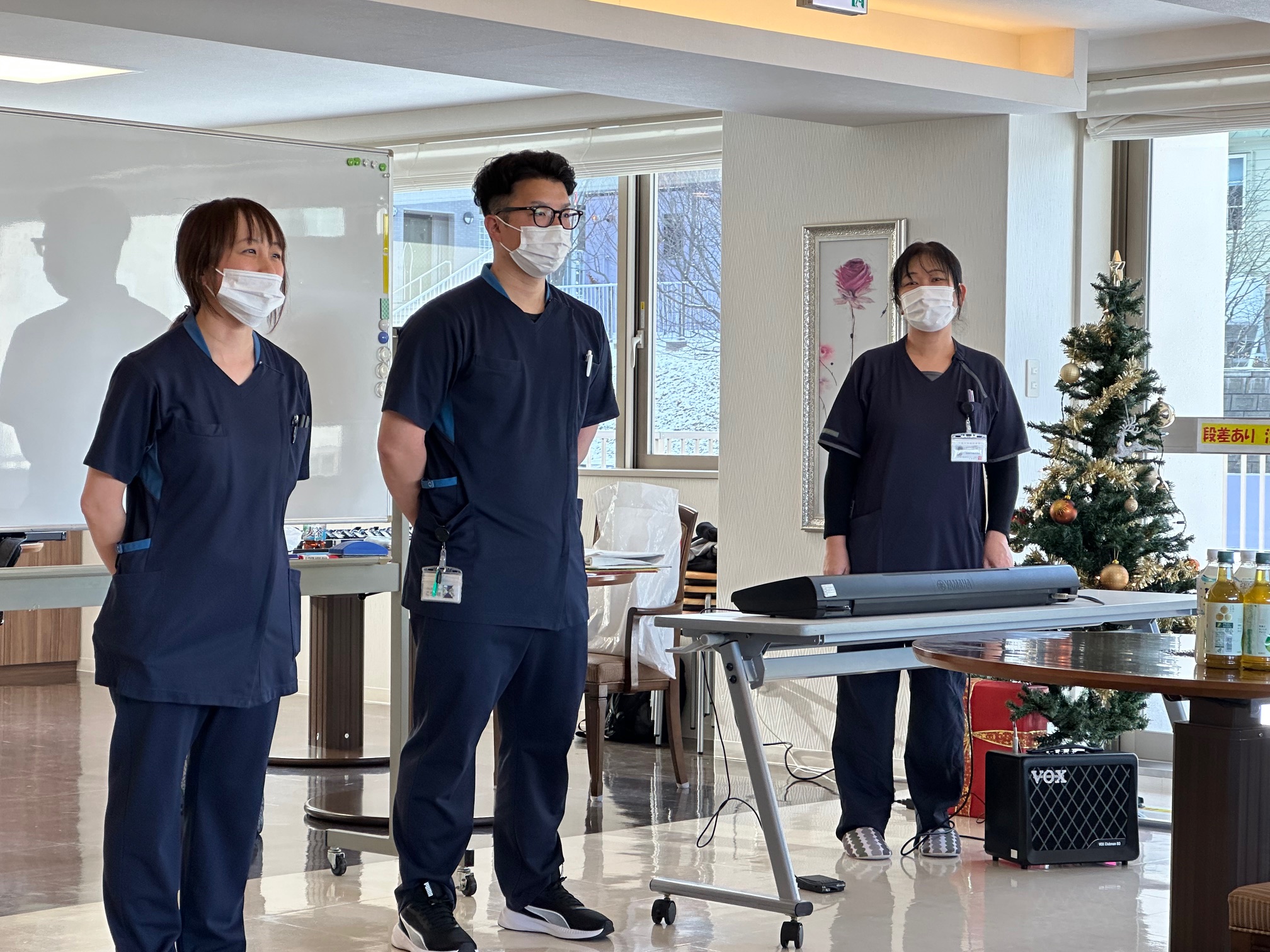12月4日(木)有料老人ホーム「らくら宮の森」4階食堂にて、地域コミュニティ企画第24弾「音楽と体操で楽しく認知症予防」を開催されました。西円山病院より職員3名を講師に迎え、音楽と運動を組み合わせた健康講座を行われました。