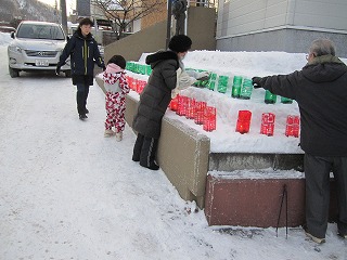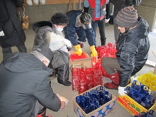 ◆前々日、明和会の方々は、明和地区会館に集まり、ペットボトルに色を塗ったほか、ペットボトルに砂を入れたり、キャンドルを飾るひな壇を整えたりして準備をしました。