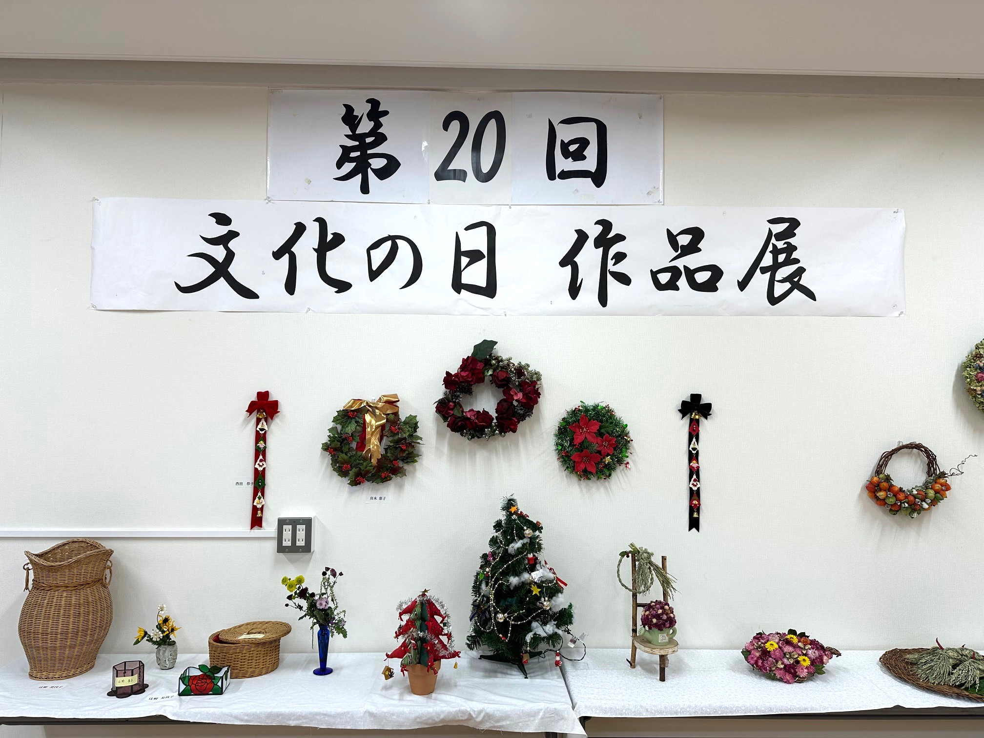 令和7年11月3日(月・文化の日)午前9時30分より、明和地区会館にて宮の森明和会主催の「第20回文化の日作品展」が開催されました。本展は、明和会女性部を中心とした関係者の作品に加え、地域のアート教室からの協力出品もあり、会場にはクリスマスリースや押し花など多彩なアート作品が並びました。来場者は作品の一つひとつに足を止め、丁寧に鑑賞しながら秋の文化の日を楽しんでいました。地域の交流と創作活動の成果が一堂に会するこの作品展は、節目となる第20回を迎え、地域文化の継承と発展を感じさせる温かな催しとなりました。