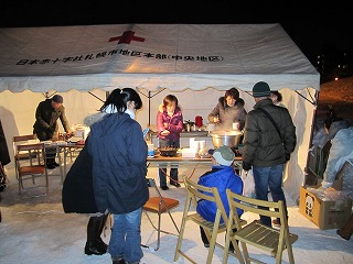 テントの中では、温かいお汁粉が無料で配布されています。吉田所長もおしるこをいただき、体を温めました。