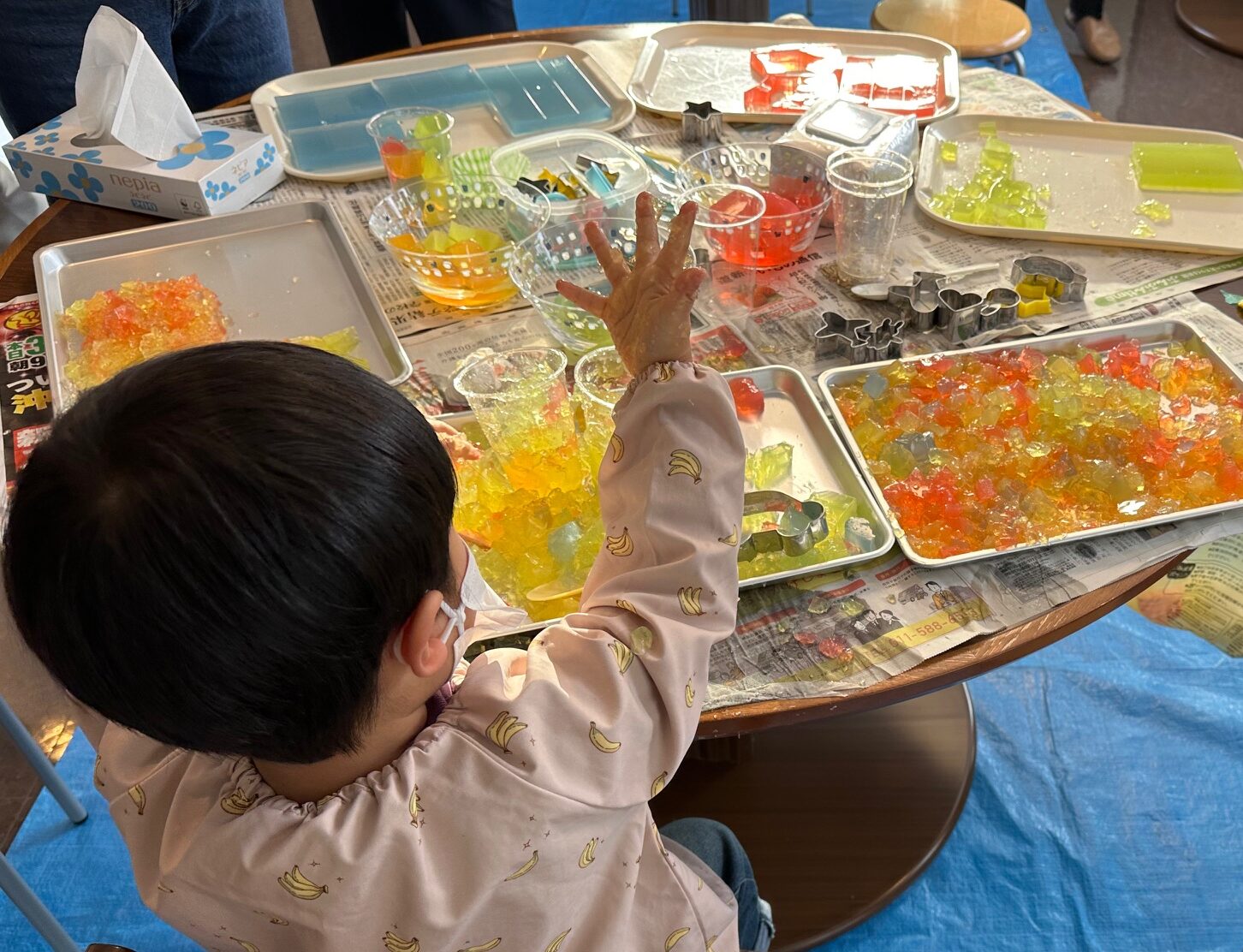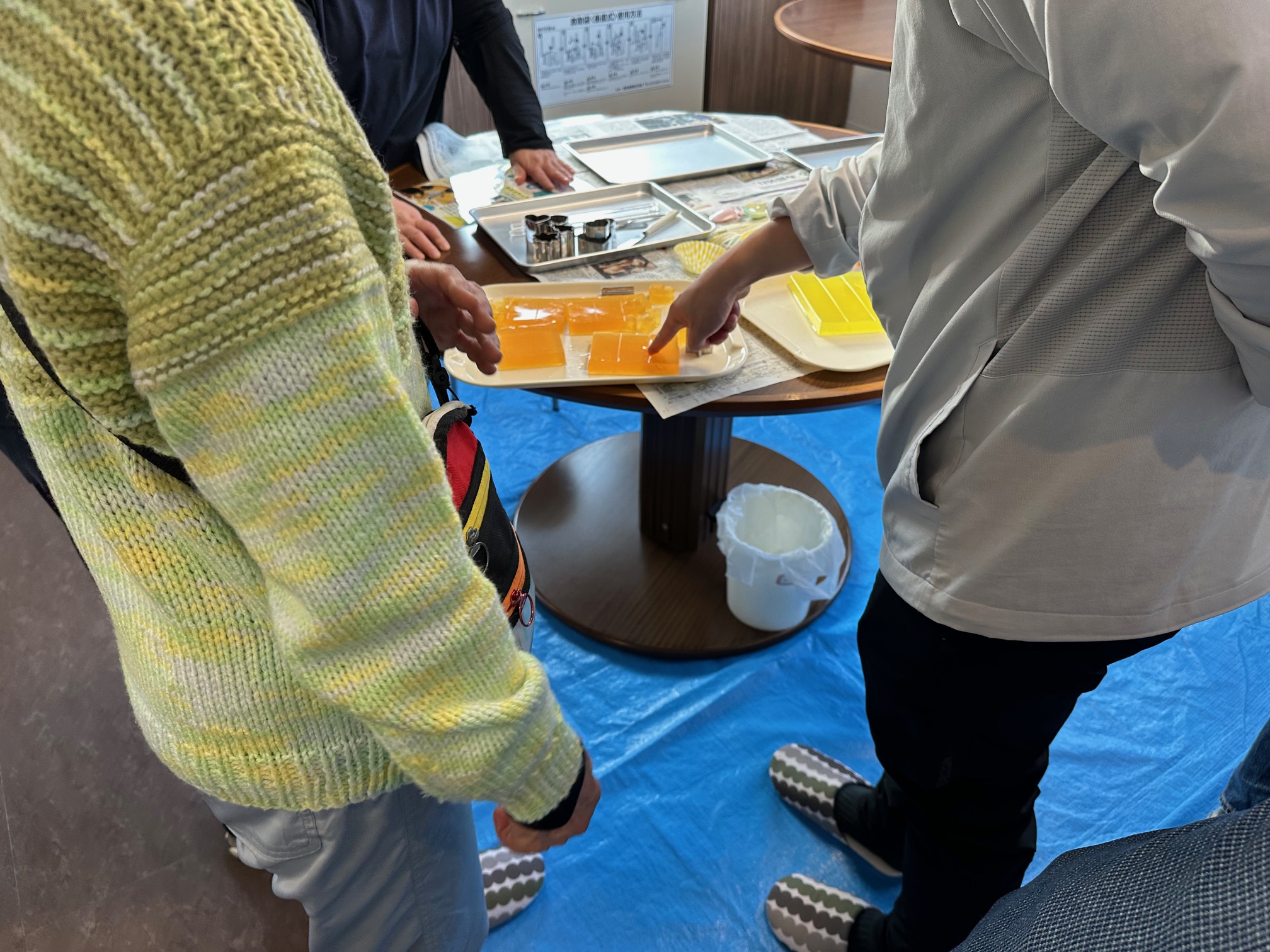 令和8年1月9日(金)、荒井山町内会主催による冬休み特別企画「多世代交流・荒井山交流会」が開催されました。 当日は伊那食品工業株式会社様のご協力をいただき、大人向け講話「食物繊維ですっきり腸活」を実施しました。講話では、寒天の基礎知識から食品としての活用、さらには化粧品や科学分野での応用まで幅広いお話を伺いました。また、寒天が熱中症予防の“体内からの冷却”にも役立つことなど、身近な素材である寒天の新たな魅力を知る貴重な機会となりました。 一方、会場の別スペースでは子ども向けの「寒天遊び」体験を同時開催。色とりどりの寒天を型抜きしたり、切ったり、握りつぶしたりと、普段なかなか味わえない独特の感触に子どもも大人も一緒になって楽しんでいました。 世代を超えて一緒に学び、触れ合い、笑顔があふれる交流会となりました。