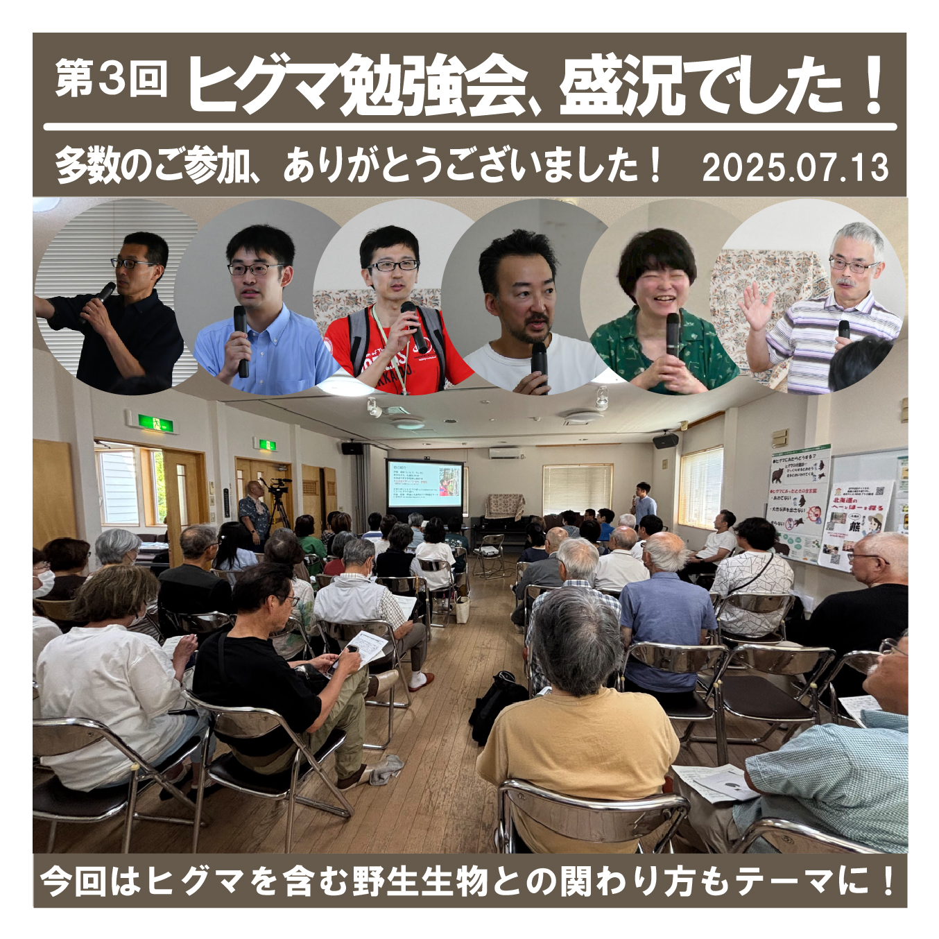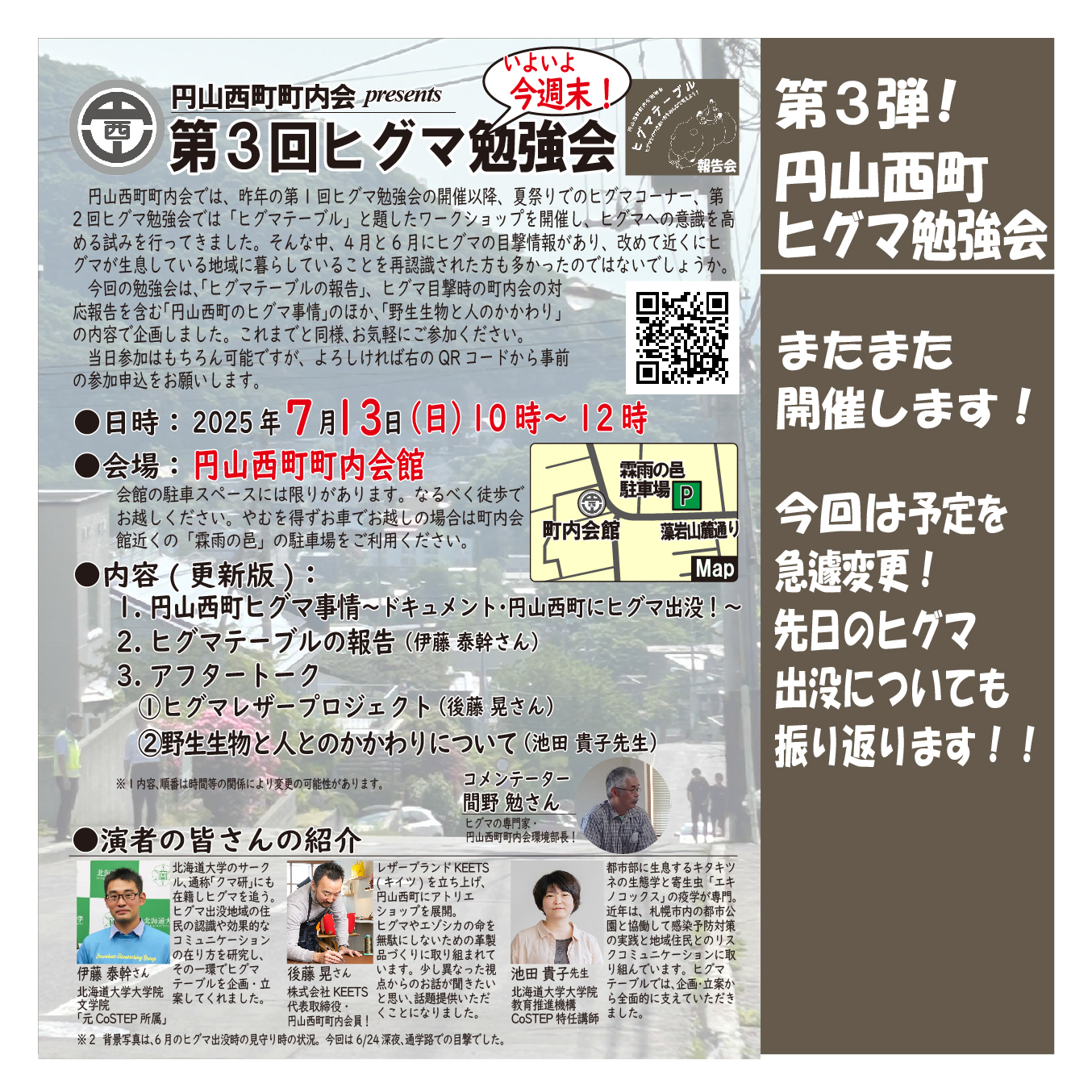 7月13日(日)、円山西町町内会館で3回目となるヒグマ勉強会を開催しました。6月24日深夜に円山西町にヒグマが出没したこともあり、当日は50名もの方にご参加いただきました。