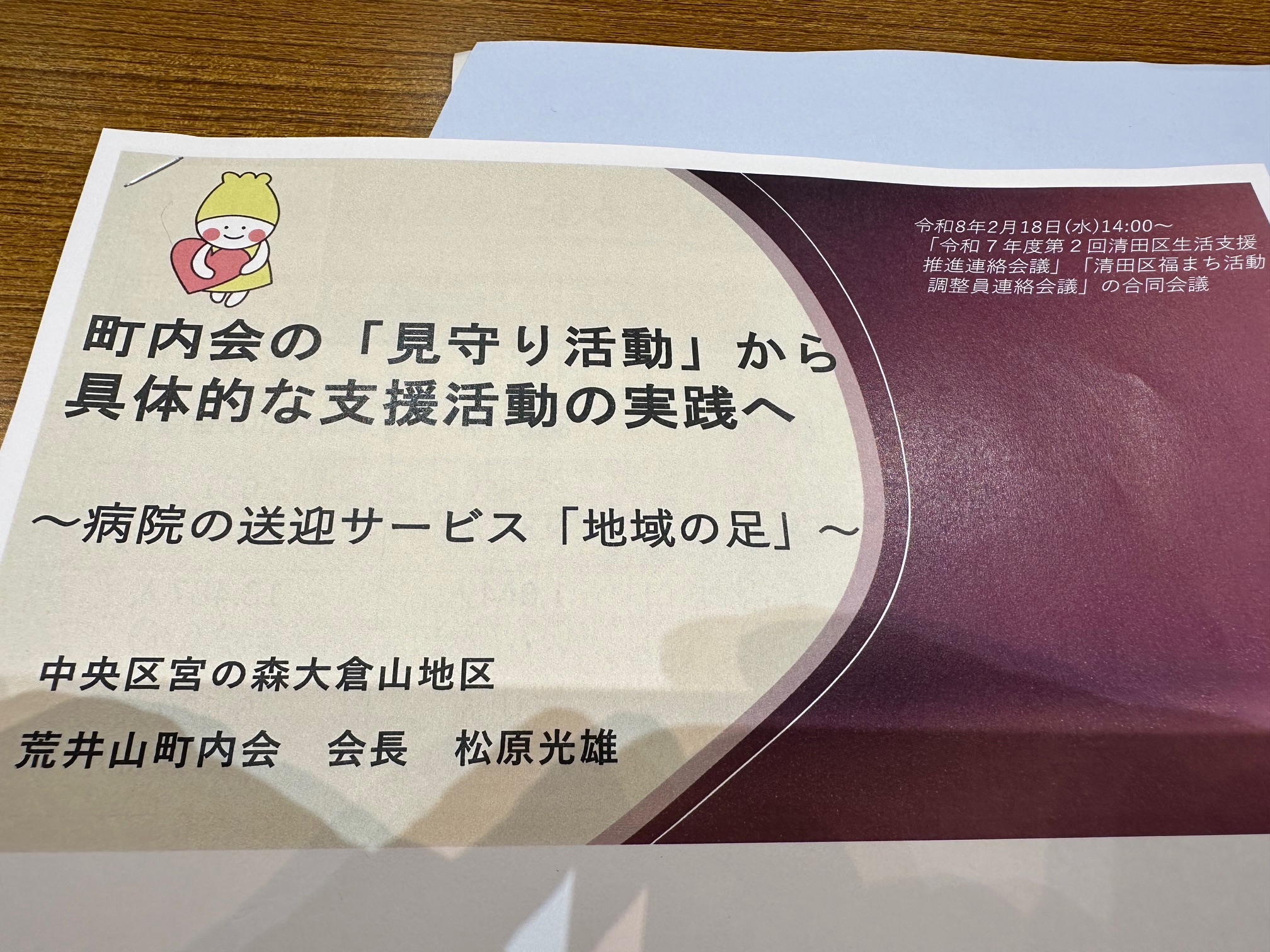 令和8年2月18日(水)、清田区民センターで開催された「清田区生活支援推進連絡会議」および「福まち活動調整員連絡会議」において、荒井山町内会が取り組む福祉活動の事例発表が行われました。