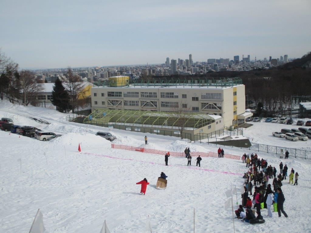2月24日(日)午前10時から、晴天の中、荒井山緑地(札幌市中央区宮の森3条13丁目)において「荒井山町内会ソリ大会」が行われました。地域の子どもや保護者など100人を超える方が訪れ、自作の段ボールソリ全26チームでタイムやデザイン、パフォーマンスを競い合いました。