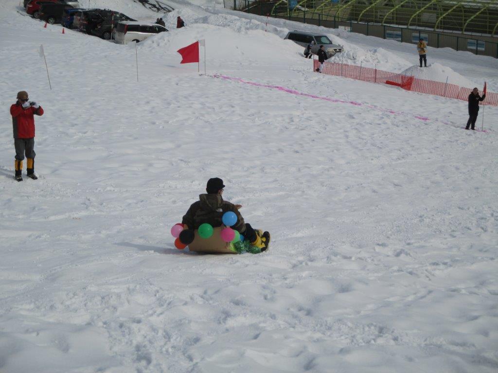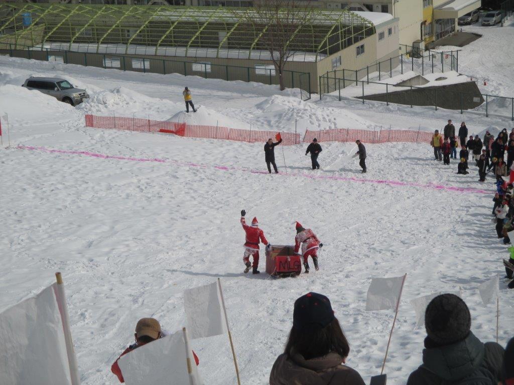 タイムレース部門ではさっぽろの都心を一望できる荒井山特設コースの斜面を色々なキャラクターなどを模した多彩なソリが駆け抜けると、来場者からは大きな歓声が上がりました。ゴールまで一直線に滑り降り、ゴール後も止まらず隣の小学校のフェンスまで行ってしまうチームやバランスを崩してコースに投げ出されたり、ソリがひっくり返ってしまうチームもありましたが、観客を含めてみんな笑顔の大会でした。