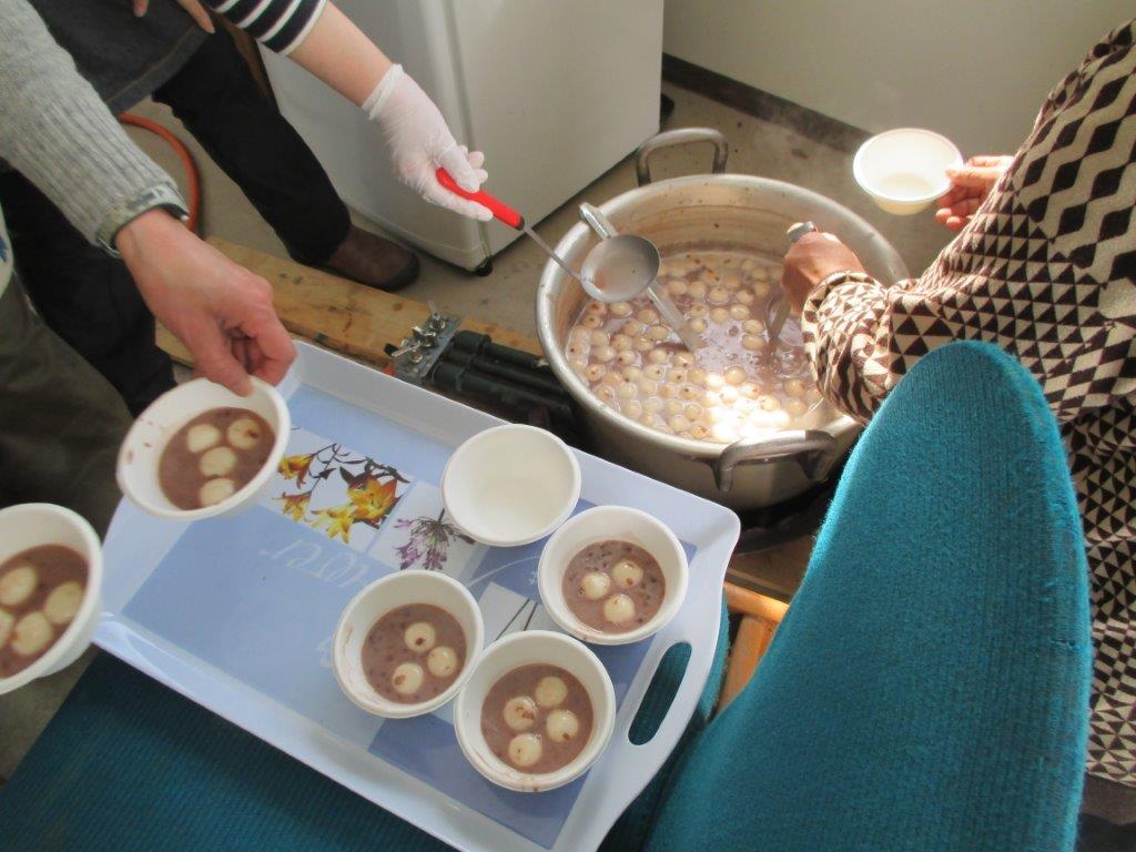 競技終了後は焼き芋やお汁粉などが振る舞われました。最後の表彰式では、滑降タイム上位チーム、ベストパフォーマンス賞などの表彰があり、温かい拍手や歓声が聞こえる中、戎会長から賞品が手渡されました。また、参加者全員にも参加賞が配られ、子どもから大人まで皆笑顔で受け取っていました。