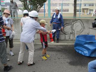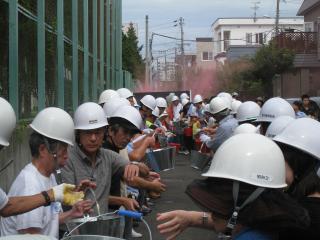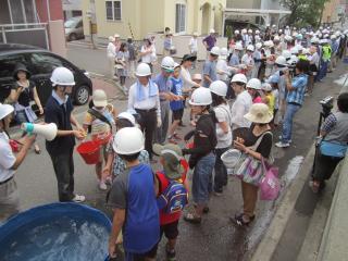 ◆次に参加者は、グラウンド横の道路に移動し、消火訓練を実施。実際に消火器を使って的に目がけて放水したり、消火栓から取水して水を汲み、2列に並んでバケツリレーをしたりしました。「水を入れたバケツを運んでばかりでは疲れるので、交替しましょう」などと言って協力しあう様子が見られました。