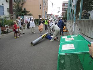 ◆平成24年8月26日(日)、宮の森小学校と周辺道路において、第21回宮の森大倉山防災フェスティバルが行われました。この催しは、宮の森大倉山連合町内会が、毎年、地域内の小学校を持ち回りで会場とし、地域住民参加による人命救助、通報、避難訓練や防災意識の啓発、自主防災組織の設立普及を図ることを目的として行っています。2部構成のフェスティバルであり、第1部は防災訓練、第2部は防災アトラクションを行っています。参加人数は第1部が約270人、第2部が約650人。今回はHBCテレビ局が取材に訪れました。連町の吉田会長によれば、「テレビカメラによる取材は今回が初めてではないか」とのことです。