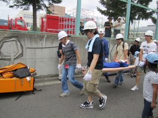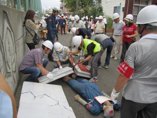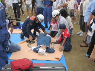 ◆続いては、人命救助訓練。これは、家屋のがれき、倒壊した電柱やブロック塀の下から人を助け出す訓練です。参加者は実際にベニヤ板をのこぎりで切ったり、鉄筋をクリッパーで切ったりして、ダミーの人形を助け出し、包帯や三角巾で応急手当をして担架に乗せました。「ダミーの人形もそれなりに重たいけど、本当の人間ならばもっと重たいかもしれない」と言いながら、グラウンドへ搬送。担架で運んだ後は、人工呼吸やAEDの使用による心肺蘇生方法について、消防団の方から説明を受けました。どなたも真剣な面持ちでじっと聞き入っていました。