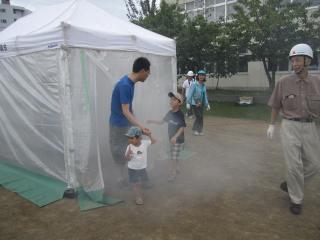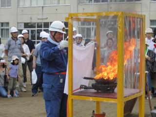◆グラウンドではそのほかにも、煙道をくぐる体験、天ぷら油の消火実験、はしご車の搭乗体験、消防服を試着するコーナーがあり、たくさんの方々が列をなして体験していました。10時頃、第1部の終了を宣言。参加者は、第2部の会場である体育館へ移動しました。