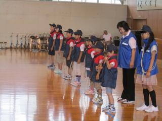 子どものリーダーによる指揮の下、幼児から小学校高学年の児童までが、規律訓練、ロープ結索訓練を行いました。ロープ結索はまさに命に関わる大切な技術。結索ができた時にクラブ員はそれぞれ「よし」と声を出して合図します。全員が一生懸命に技術を披露。特に小さなクラブ員が時間をかけながらも、ロープの結索ができて「よし!」と力強く声を出したときは、会場から大きな拍手が沸き起こりました。