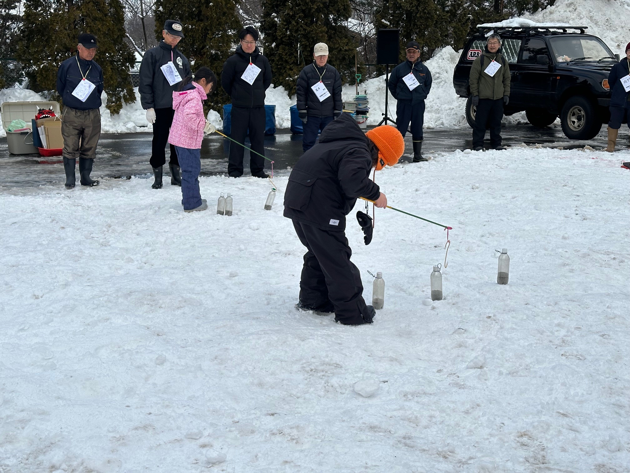 最初の競技は、ビン釣りリレー。ビンに取り付けられたリングにフックを引っかけるのですが、なかなか思うように釣り上げることができず、「神の手」と呼ばれる審判の絶妙なアシストも入り、会場は笑いと歓声に包まれました。